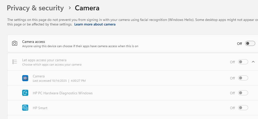 You’ll see which apps recently accessed your camera with timestamps. This helps identify suspicious activity and apps that may trigger your webcam without permission.