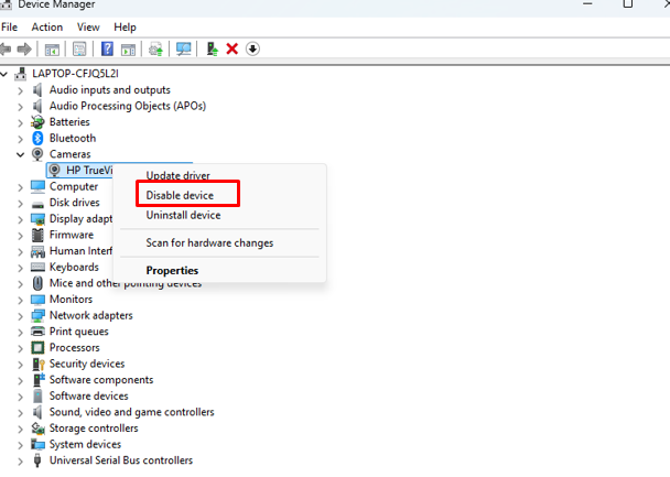 Press Windows + X and select Device Manager, expand Cameras or Imaging devices, right-click your webcam, and select Disable device, then confirm. This blocks all software access until re-enabled.