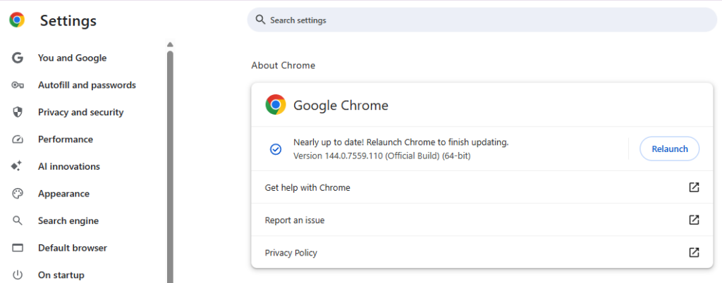-After relaunch, Chrome will confirm “Google Chrome is up to date.”