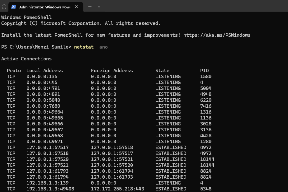 Step 3: Look for “ESTABLISHED” connections to unfamiliar IP addresses, particularly on ports commonly used for remote access (3389 for RDP, 5900 for VNC, 5938 for TeamViewer).