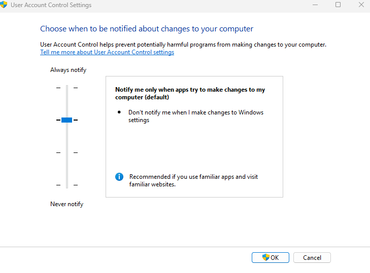 This setting requires administrator approval before programs can make system changes, blocking many malware installations.