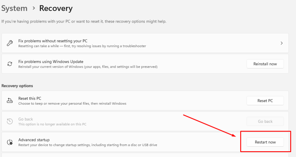 - Under “Advanced startup,” click Restart now