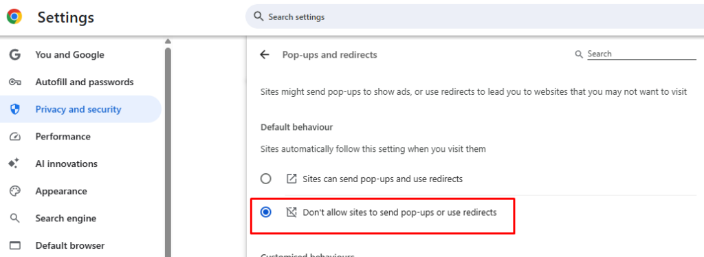 - Choose “Don’t allow sites to send pop-ups or use redirects”