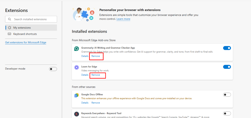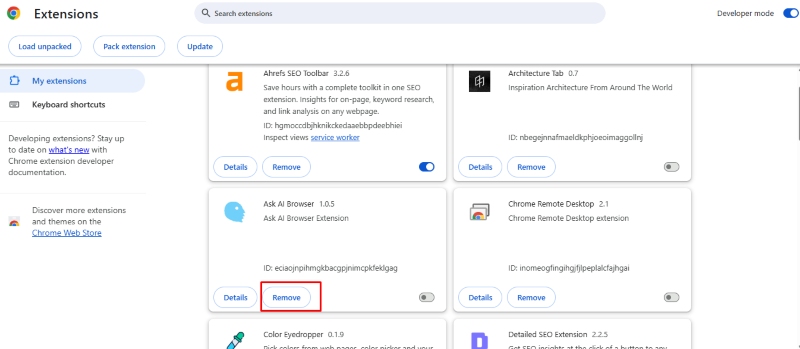 -Examine each extension. Click the toggle switch to disable suspicious ones, then click “Remove” to uninstall them completely.