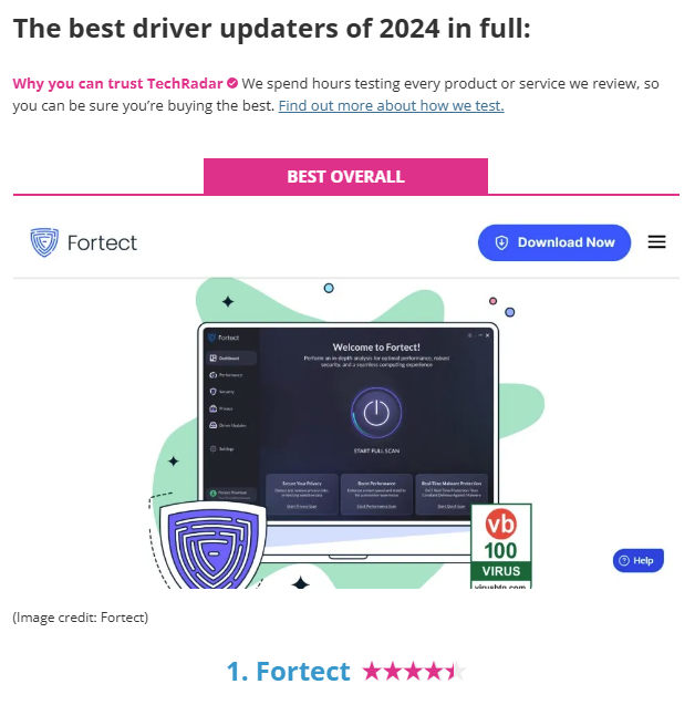 Back in 2024, TechRadar awarded Fortect Driver Updater the #1 spot in its best driver updater roundup, scoring an impressive 4.5 out of 5. Two years on, that ranking hasn’t changed. As of 2026, Fortect continues to hold TechRadar’s top position, a testament to its consistency, reliability, and ongoing development.