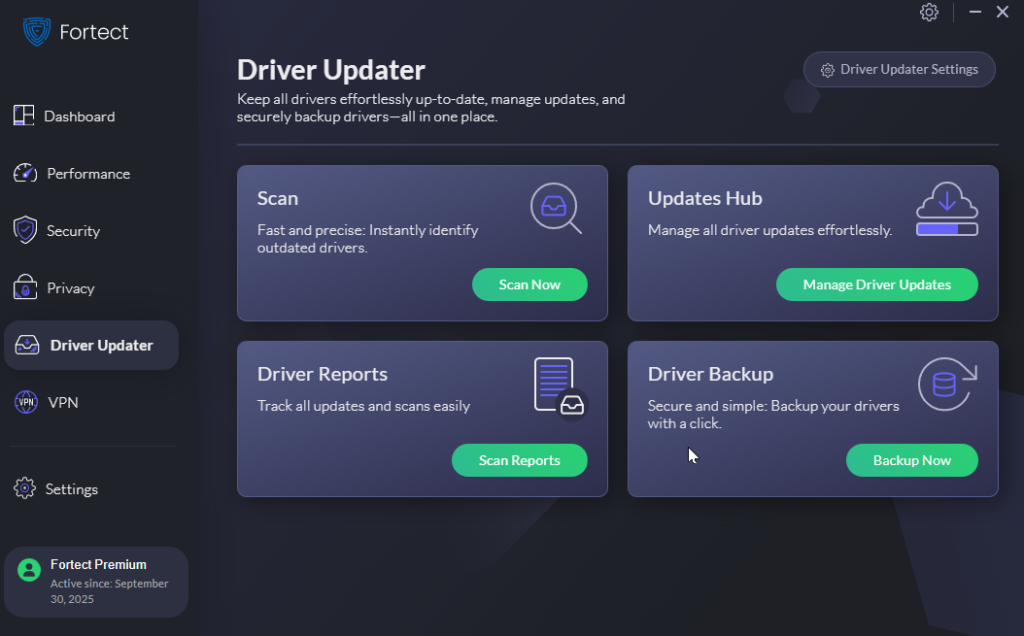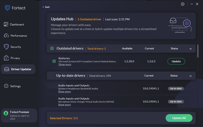 Fortect Driver Updater does what most driver tools overcomplicate: it keeps things fast, clean, and effective. It scans for outdated and corrupted drivers and gets them updated in minutes, while also offering security and PC optimization features that set it apart from competitors like Ashampoo and AVG Driver Updater.