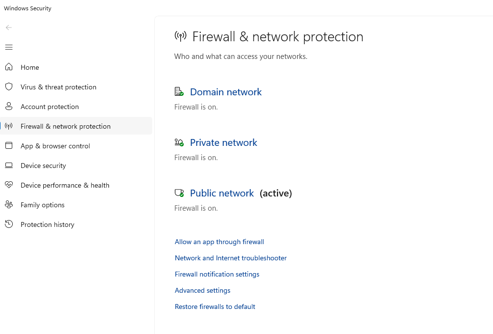 Step 4: Click “Public network” and verify “Windows Defender Firewall” is switched on. This is crucial when connecting to any public Wi-Fi